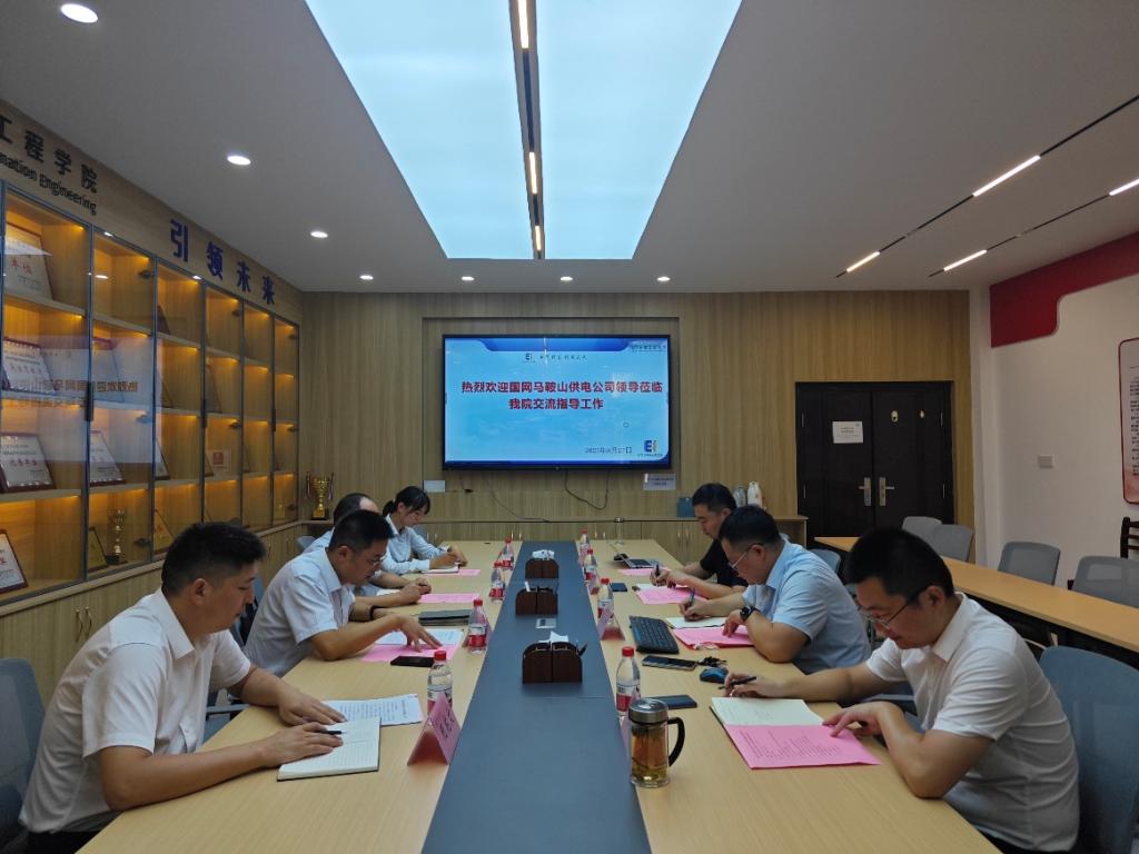 的办学历史、专业建设发展、科研平台建设、人才培养特色和毕业生就业创业等情况,肯定了双方前期的对接与合作工作,指出双方同处一个城市,学科专业吻合度高,人才培养合作潜力巨大,本次对接交流为后续工作深化打下坚实基础。魏敏介绍了马鞍山供电公司的历史沿革、当前市电网的运行现状以及长远需求规划,详细介绍了当前市域范围电网管理的数字化转型和新型电力系统建设的旺盛技术需求,指出高校人才和技术密集,合作空间巨大。会上,双方围绕校企产学研协同创新、人才培养与输送、党建共建、实习实训基地建设等多个方面进行了深入交流和探讨;一致认为,在构建新型电力系统、微电网调度智能优化、电力设备智能运维与故障诊断、无人化输电线路巡检等前沿技术领域,双方具有广阔的项目合作空间。此外,结合安徽省区域经济发展需求,双方还初步探讨了多项潜在合作场景。