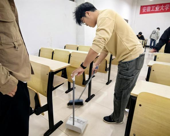 活动过程中,同学们热情饱满,干劲十足。大家分工明确,一组同学仔细清扫电气楼教室及周边公共区域,认真擦拭桌椅、清理地面、整理杂物,不遗漏任何卫生死角;另一组同学则前往电气楼门口及周边,规范摆放共享单车,优化校园通行环境。大家不怕脏、不怕累,以实际行动践行责任与担当,展现出积极向上的精神风貌。