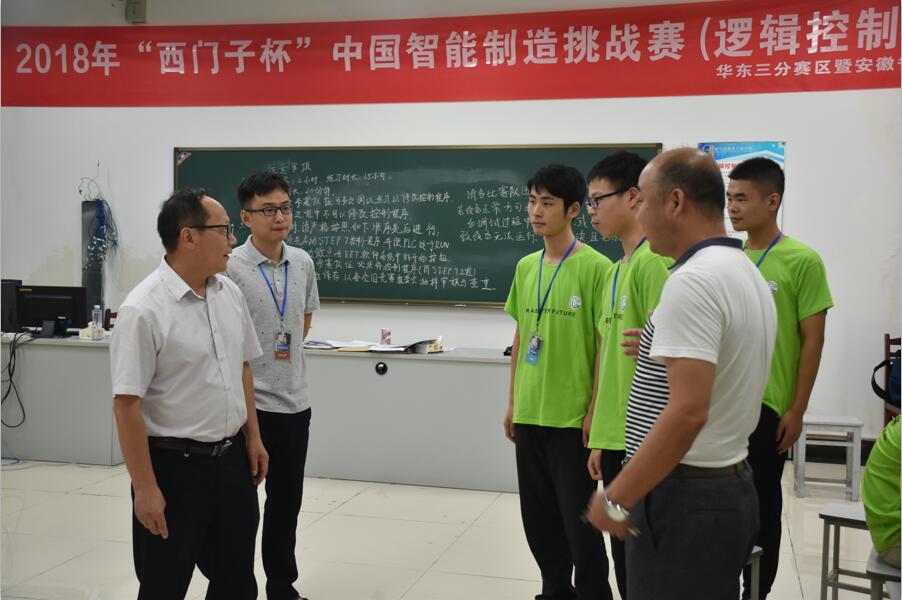 8月24日,2018“西门子杯”中国智能制造挑战赛安徽省赛暨华东三分赛区在安徽工业大学电气成人动漫 拉开帷幕。葛芦生副校长冒着酷暑来到电气成人动漫 慰问志愿者
