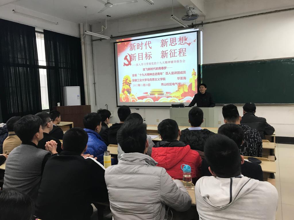 11月20日下午,电气学院组织举办深入学习贯彻党的十九大精神辅导报告会。主讲人是安徽省“十九大精神走进青年”百人宣讲团成员,安徽工业大学马克思主义成人动漫