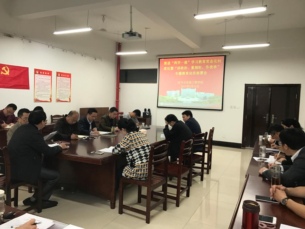 在电气楼304会议室召开党委中心组理论学习(扩大)会,就认真推进“两学一做”学习教育常态化制度化暨“讲政治、重规矩、作表率”专题教育工作作动员部署。学院党委中心组成员、各系室中心主任参加会议。会议由院党委书记叶凤华主持。