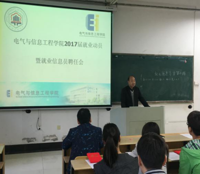 在电气楼112召开了2017届毕业生就业动员暨就业信息员聘任会议,院党委副书记、副院长郭宏,分团委书记孔洋波,各年级辅导员,2017届毕业班各班就业信息员、主要班干、寝室长参加了此次会议。会议由毕业班辅导员张敏主持。