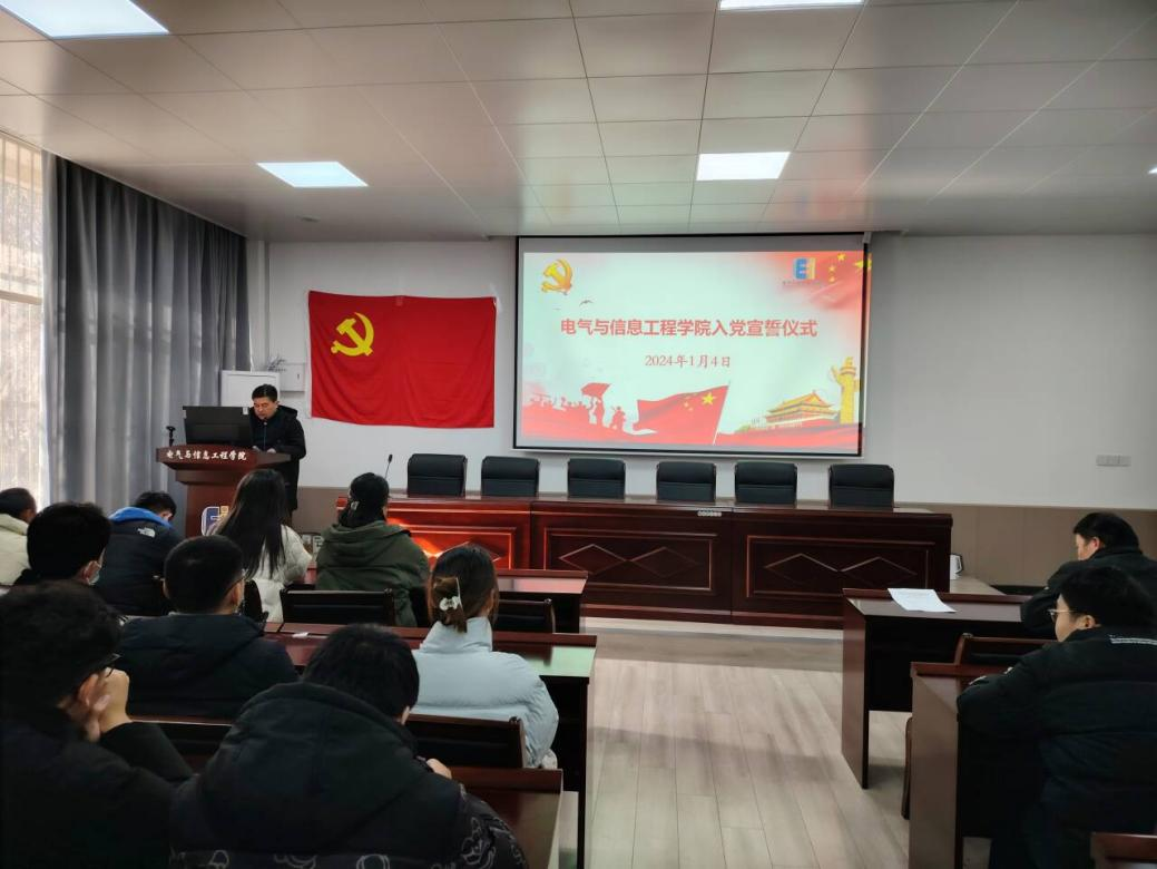 在电气楼113教室举行新党员入党宣誓仪式。院党委副书记、纪委书记、副院长李克明、各学生党支部书记、各年级辅导员、2023年12月新发展的党员以及全体学生党员参加了仪式。