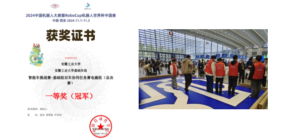 的微电子专业23级叶家明组成的参赛队(指导教师:钱牧云)凭借出色的技术实力和密切的团队协作,在基础组双车协同任务赛电磁组别中勇夺全国冠军。