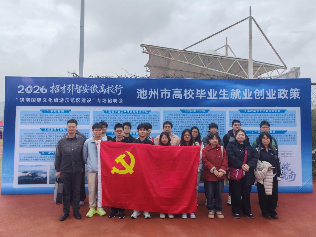 学生测控党支部组织毕业生党员和入党积极分子、2026届未就业学生代表赴池州市开展“党建赋能・助梦启航”促就业活动,实地走访参加招才引智安徽高校行之“皖南国际文化旅游示范区建设”专场招聘会。