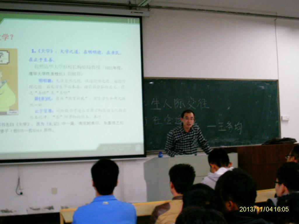 大学生正处于青春期末期,是一个人从孩子到成人的蜕变时期。针对这个特殊敏感时期,王老师从人际交往的含义、基本成分、形成与发展的过程以及心理效应等四个方面向同学们作了简明扼要的介绍;随后,从“何为大学”,“大学的学习”,“大学生人际交往”,“大学生社会适应”四个方面进行了详细阐述。他指出,当代大学生多为独生子女,比较自我,容易忽视别人的感受,因而导致交往困扰,并针对性地提出了几点切实可行的建议,比如换位思考,保持平静,主动地关心别人,学会赞美别人等等。