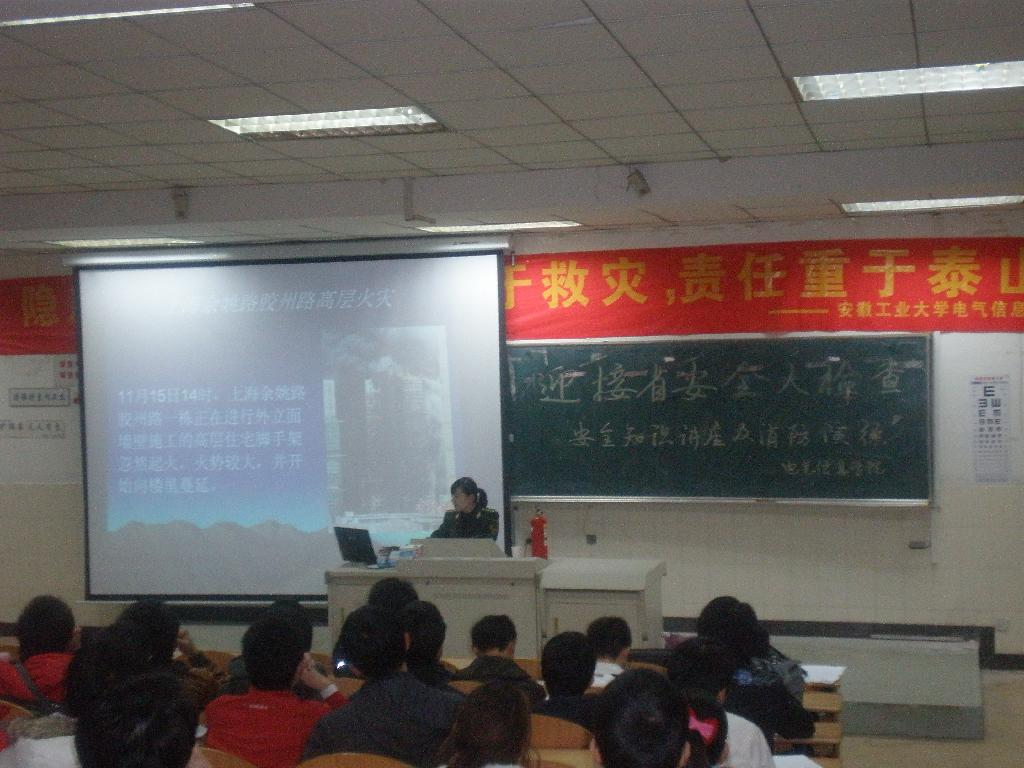 接着马鞍山消防支队汪工程师给同学们上了一堂生动的消防安全知识课。课堂上,汪工程师用生动的语言讲解了如何报火警、火灾的预防、火场自救及逃生方法等消防安全基本常识,并针对当前学校的消防安全工作形势和火灾特点,向学生讲解了用火、用电注意事项,强调一旦身边发生突发事件,要沉着应对,做好安全逃生工作,使同学们受益匪浅。讲座过程中,同学们都在专心倾听并认真做笔记,讲到相关话题时,积极参与讨论,踊跃发言,现场气氛十分活跃。