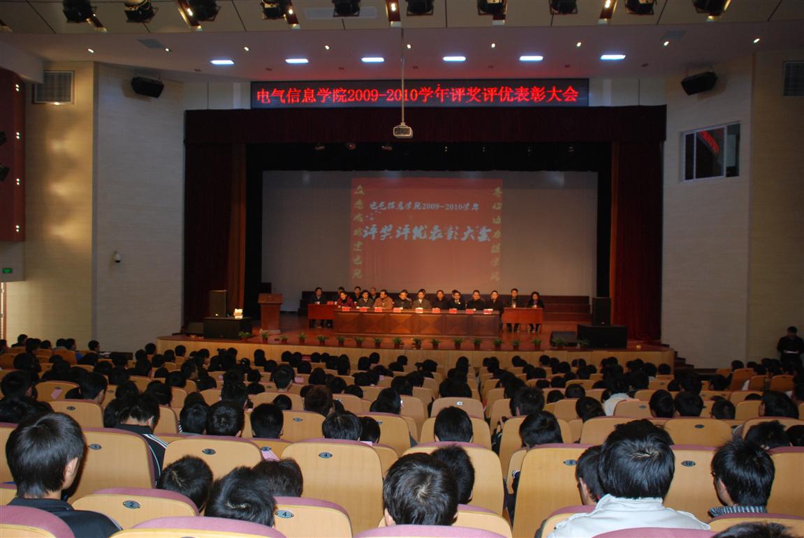 2009-2010学年度学生评奖评优表彰大会在东区新大学生活动中心隆重召开。校党委副书记汪光阳,校关工委主任李明,学工部部长陈选华,校团委书记方华,电气信息成人动漫