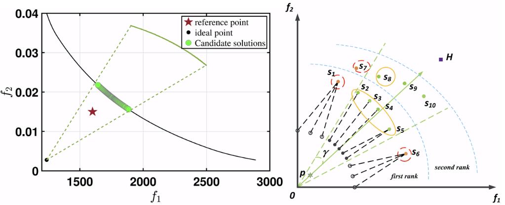 针对传统偏好多目标优化算法在复杂决策场景中难以确定偏好区域的问题,团队提出了一种基于偏好距离度量指标的偏好多目标优化算法。该算法通过利用决策者提供的偏好点和角度信息,结合方向角与坐标变换构建偏好模型,确定偏好区域;基于偏好距离和惩罚距离设计偏好指标,引导算法在决策者偏好区域内搜索最优解集。实验结果表明,所提算法能有效应对偏好变化,协助决策者找到偏好最优解。相关研究成果发表在《Swarm and Evolutionary Computation》(IF:8.5,Top期刊)。我校为论文第一完成单位,李飞副教授为论文第一作者,南京信息工程大学巩在武教授为论文通讯作者。