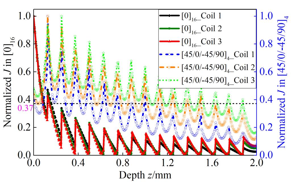 为满足CFRP损伤涡流检测的应用需求,本研究探索了电磁场在多层CFRP板结构中的传播、衰减与扩散特性,解决了多层导电介质交界面处的场量突变问题。研究结果表明,材料的电各向异性是电磁场快速衰减的关键因素,由波印廷定理知强电各向异性造成更多的能量损耗,使得电磁场的衰减特性与频率无关。铺层变化是影响电磁场衰减与扩散的又一重要因素,电磁场的衰减与扩散和相邻铺层角度差呈反比。从入射场角度看,激励源形状是影响电磁场传播特性的另一重要因素,电磁场的衰减与扩散和激励源形状呈反比。该研究结果为定量检测与评估CFRP结构深处缺陷奠定了理论基础,同时为涡流检测探头的设计/优化提供了理论依据。