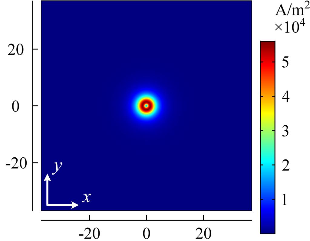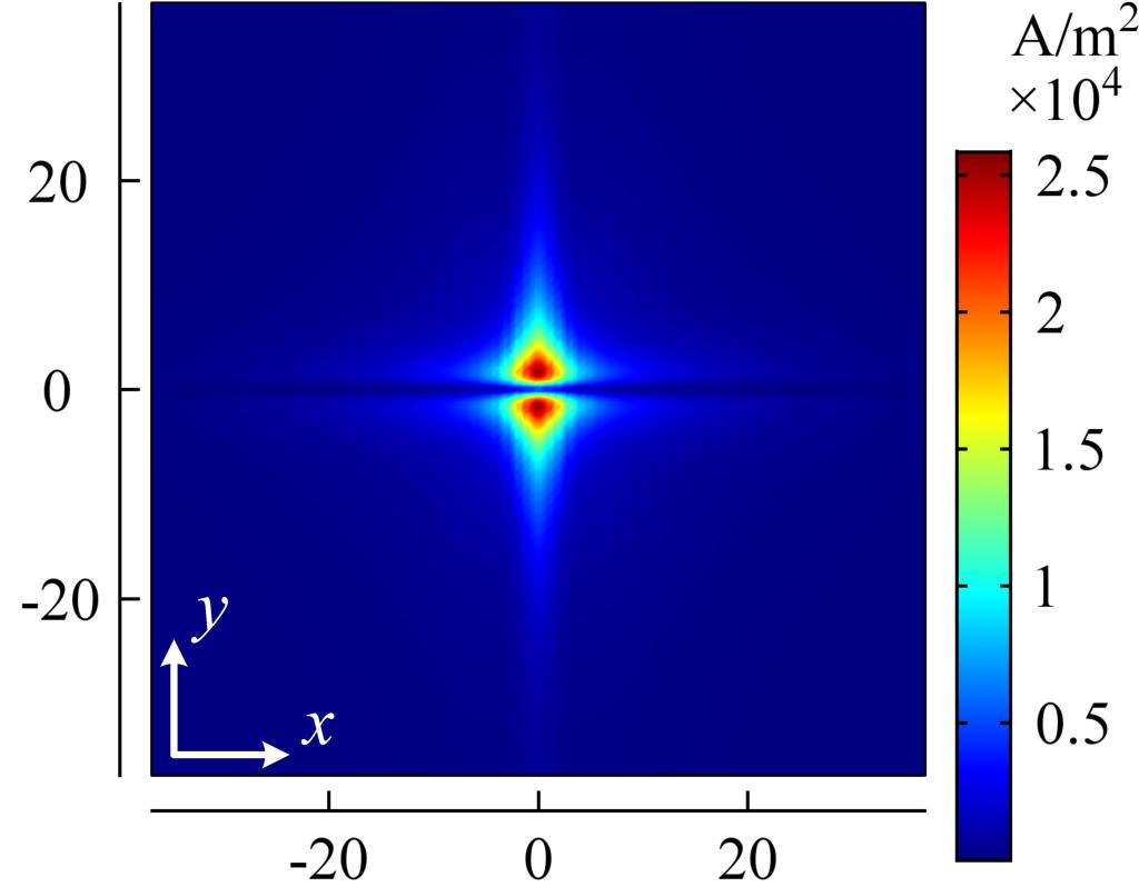 (电流密度|J|在碳材料(左)、CFRP单向板(中)和CFRP正交板(右)x-y面内的分布情况)