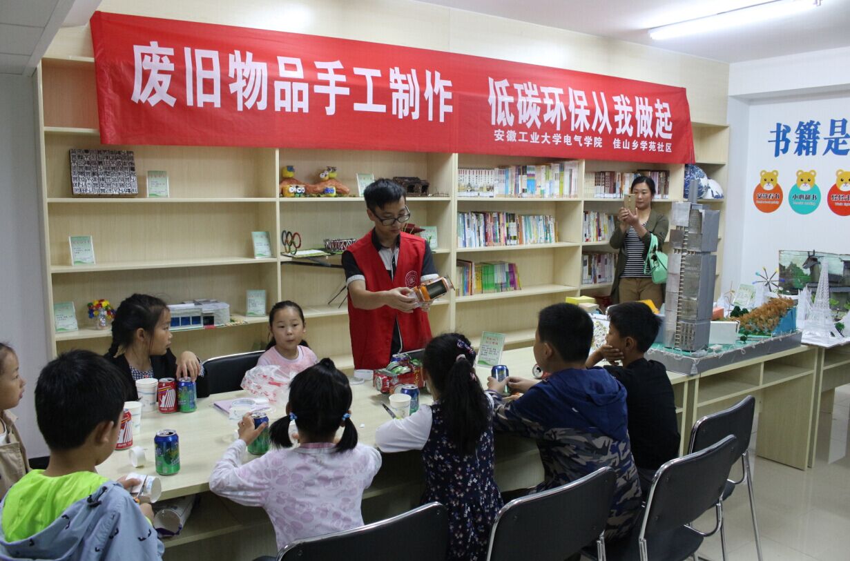 志愿者们早早地来到了社区活动室准备材料,收拾桌子。小朋友们在妈妈的带领下来到了社团活动室。志愿者们先带着小朋友参观利用废旧物手工制作的天安门、“马鞍山”号航空母舰、观赏小卡车、狙击枪等创新作品。小朋友欢快地跳跃着,好奇地询问制作的材料和方法。志愿者们精彩的讲解和精湛的手工制作也赢得了家长们的赞许和掌声。最后,志愿者们带着小朋友一起利用易拉罐做手工。
