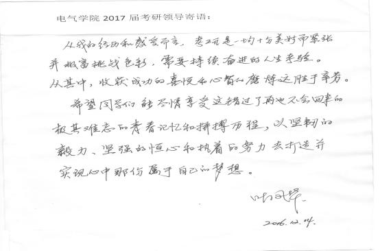 领导精心题写了考研寄语:“考研是一场十分美妙而紧张并极富挑战色彩,需要持续奋进的人生考验”、“梅花香自苦寒来”激励考生坚持到底,实现梦想。临考前,年级辅导员通过QQ、微信等网络平台为同学悉心提醒。考试当天辅导员在考场门口为考研学子鼓劲加油。