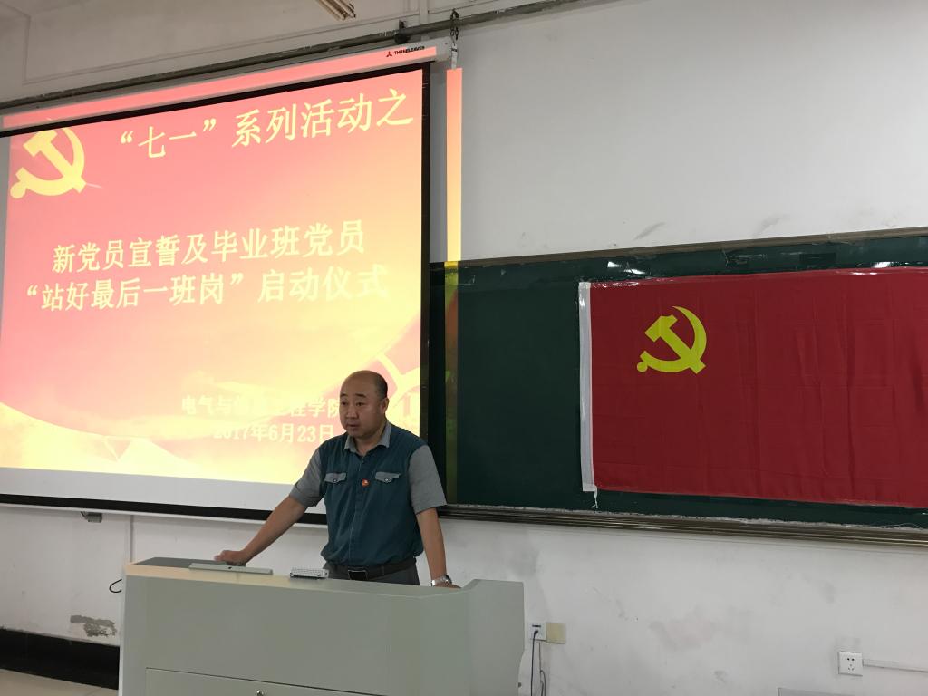 举办新党员宣誓及毕业班党员“站好最后一班岗”启动仪式,院党委副书记、副院长郭宏、全体学生支部书记、全体学生党员参与活动。活动由陶源主持。