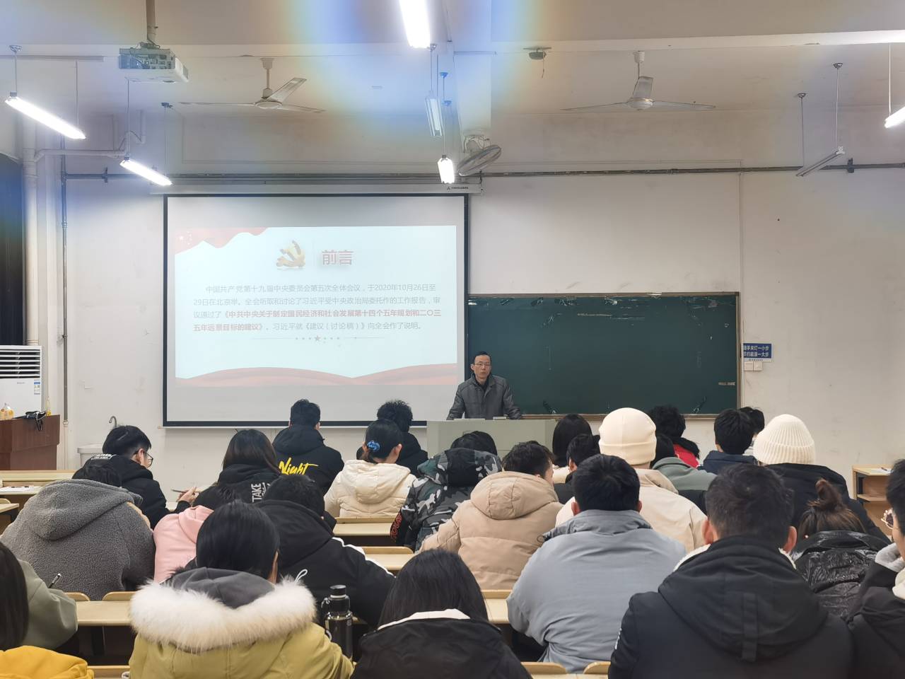 党委书记丁忠利在电气楼112,以《党的十九届五中全会精神解读》为题,为成人动漫