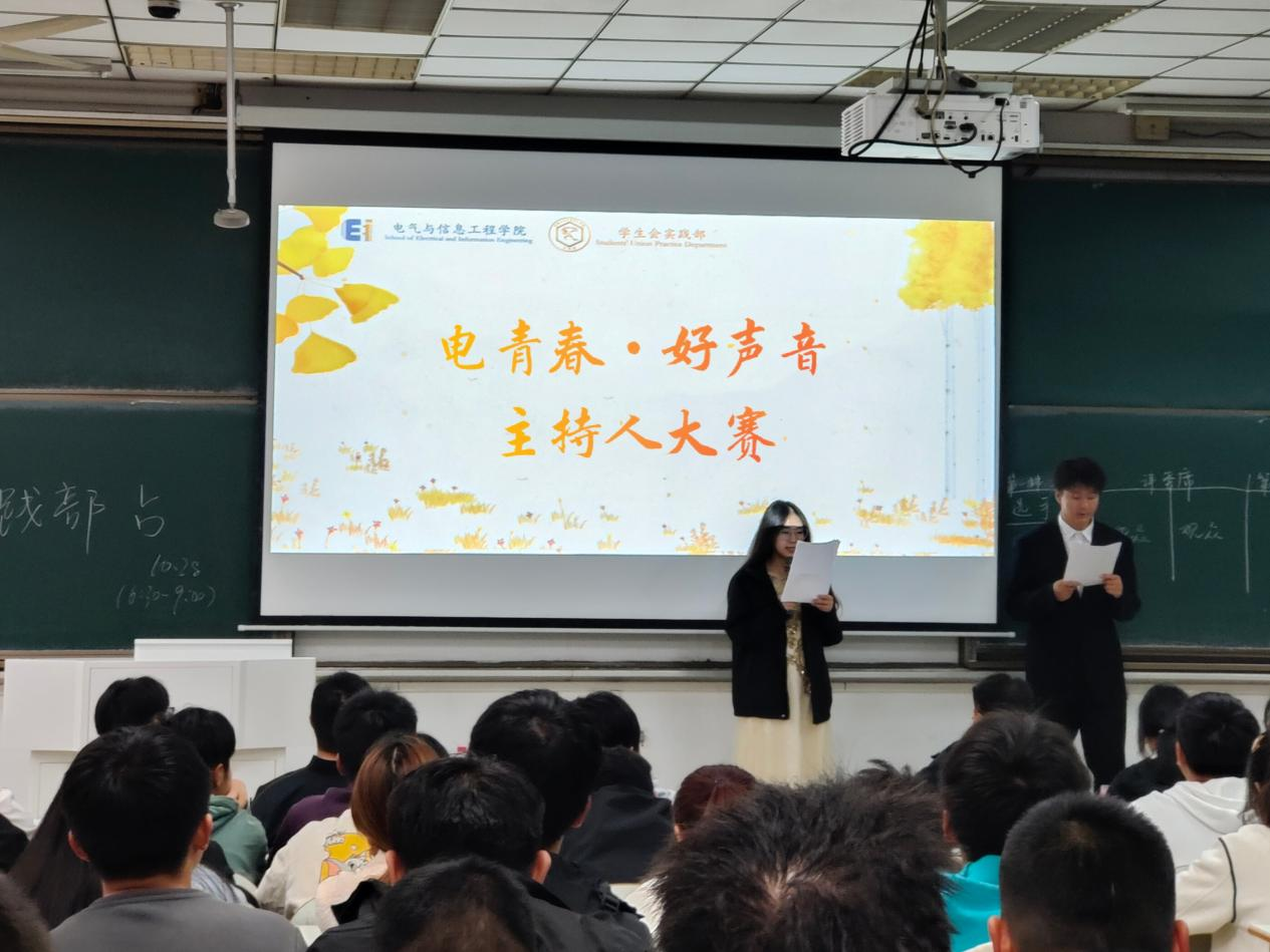 在佳山校区教三南303举办“电青春·好声音”主持人大赛,2024级辅导员、院团委学生会干部担任评委。