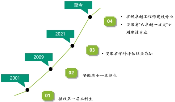 本专业自2001年开始招收本科生,2009年开始在安徽省一本招生,至今连续培养已有16届毕业生。2021年安徽省学科评估结果为A+,省级卓越工程师建设专业,安徽省“六卓越一拔尖”计划建设专业。为安徽省及华东地区电子信息及相关行业输送了大批专业技术人才,毕业生因基础扎实、能力突出深受用人单位好评,近5年的毕业生就业率平均96%以上,一直名列学校前茅。考研升学率达35%左右。本专业于2020年受市政府委托培养面向长三角区域通信方向的产业人才,增设1个班,执行不同的培养方案。