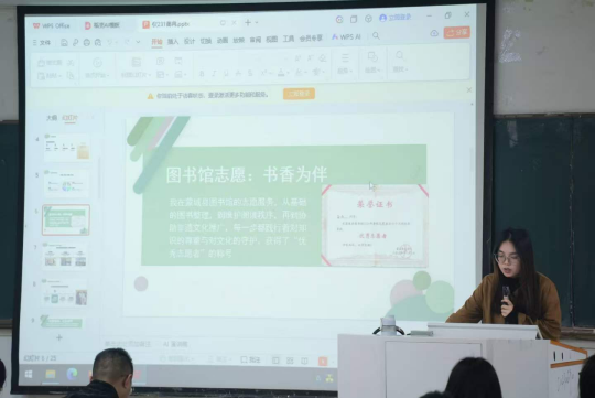 持续深化志愿育人工作,广大学子积极投身社区帮扶、校园服务、公益实践等一线岗位,以真诚行动传递温暖,以青春力量践行奉献,营造了崇德向善、乐于奉献的浓厚校园氛围。本次评选自启动以来,历经个人申请、班级推荐等环节,最终6名优秀志愿者候选人脱颖而出,进入现场答辩环节。答辩会上,候选人依次上台,通过PPT展示、事迹讲述、心得分享等形式,全面呈现各自在志愿服务领域的实践历程与丰硕成果,尽显青年奉献担当。